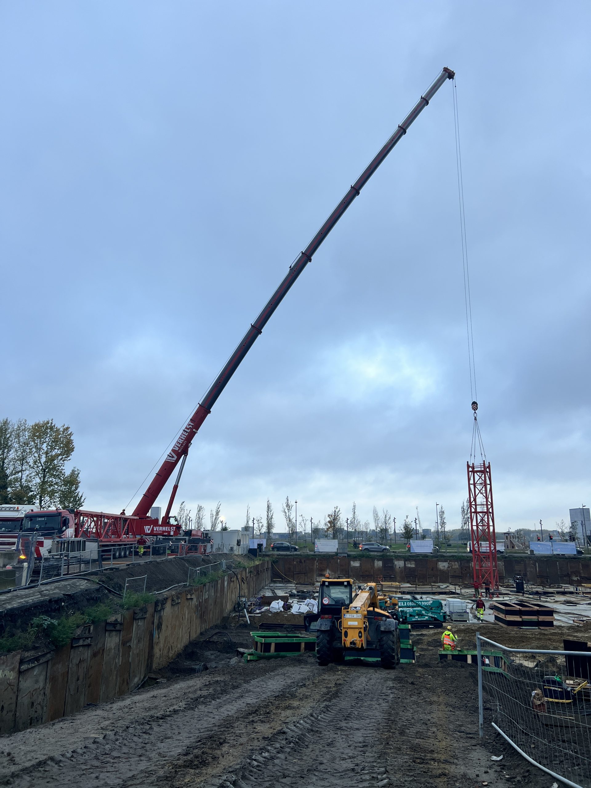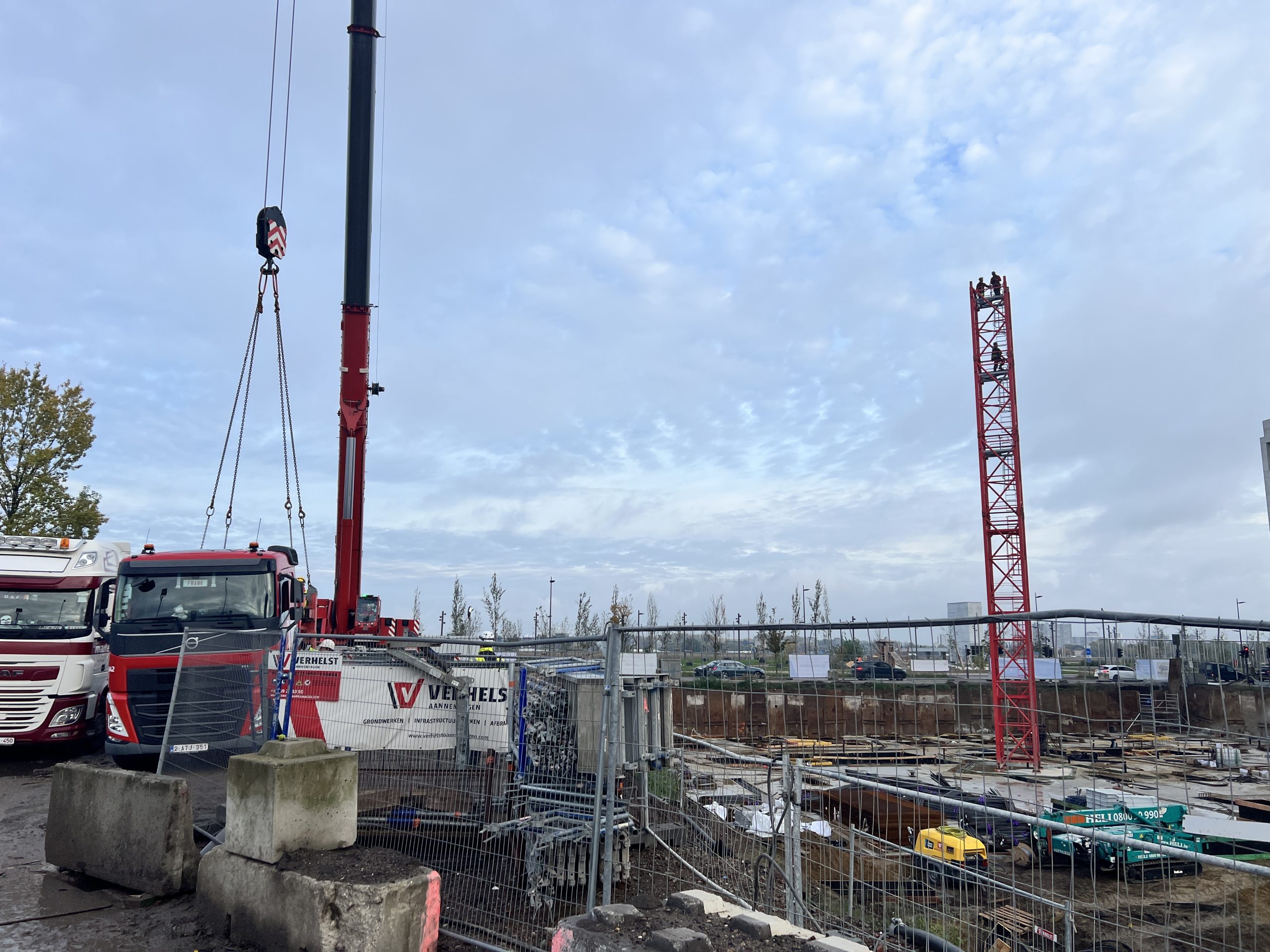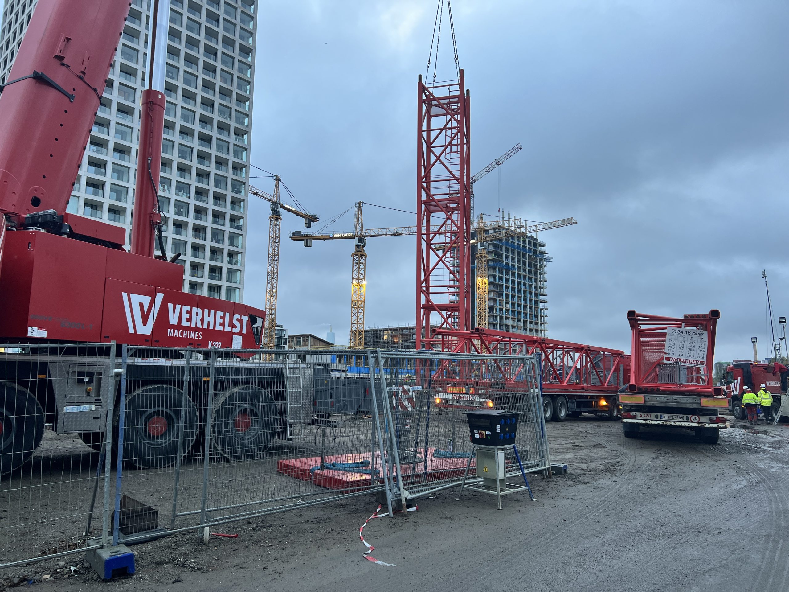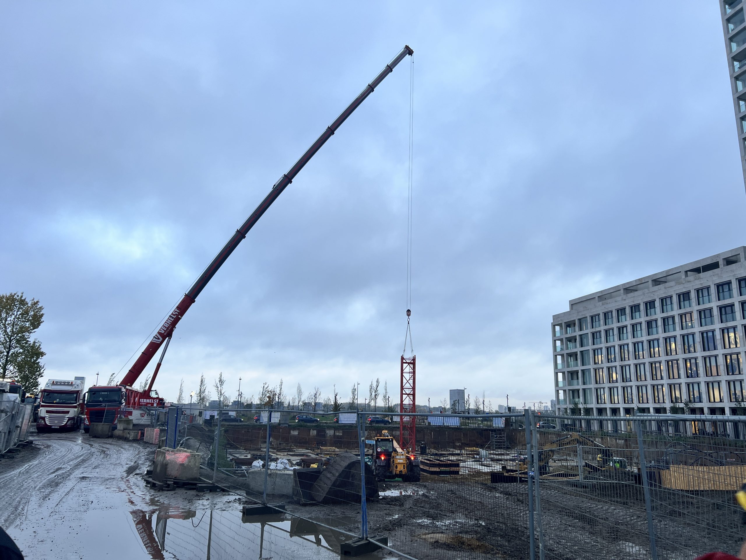 Vroeg in de ochtend hing er al een gespannen maar opgewonden sfeer op onze werf te Nieuw Zuid. De vrachtwagens met kraanonderdelen reden één voor één het terrein op, terwijl de ploeg zich klaarmaakte voor de montage. De zon brak net door de wolken toen de montagekraan, 300 T, zijn eerste beweging maakte – langzaam, precies en indrukwekkend.