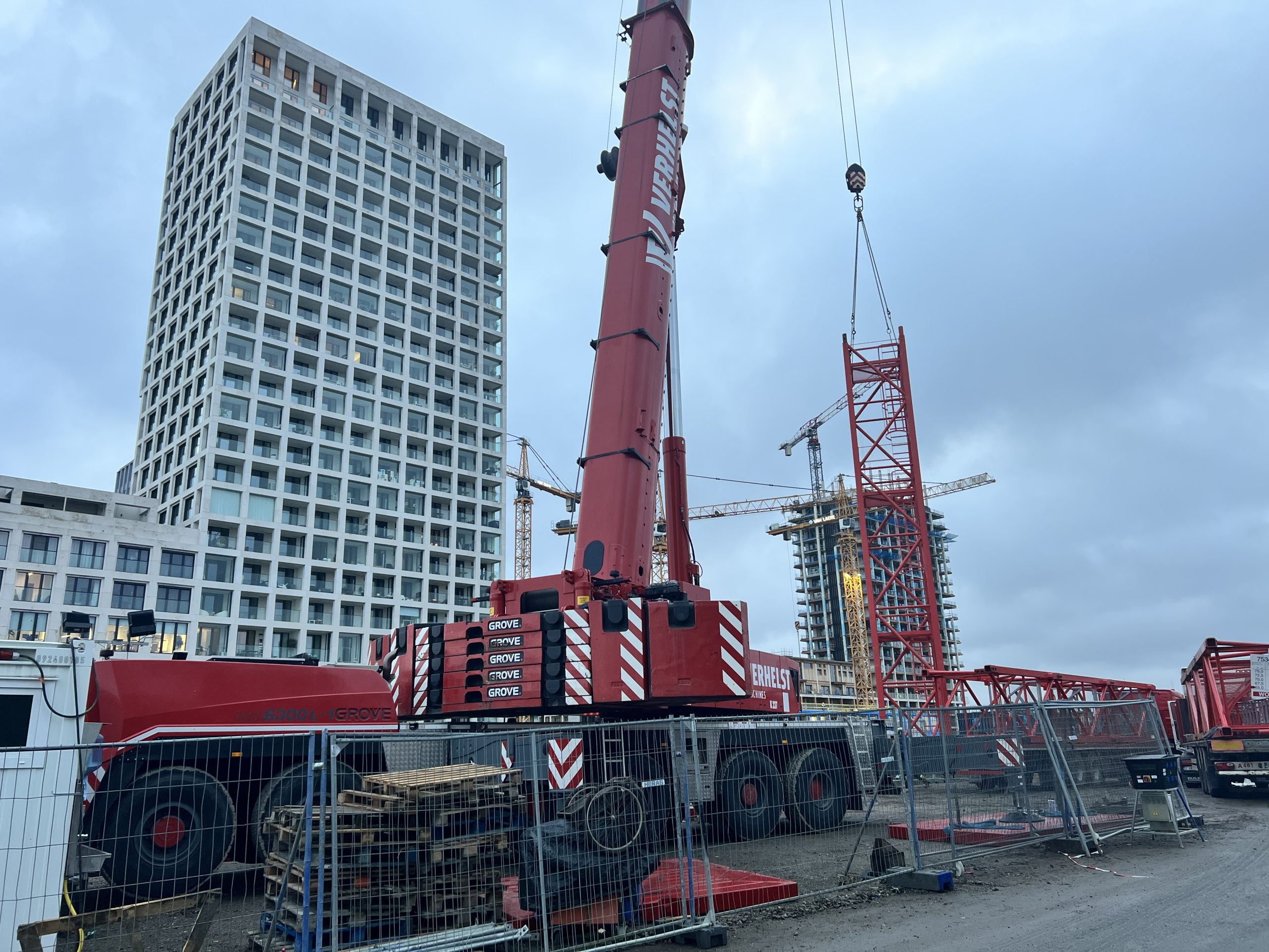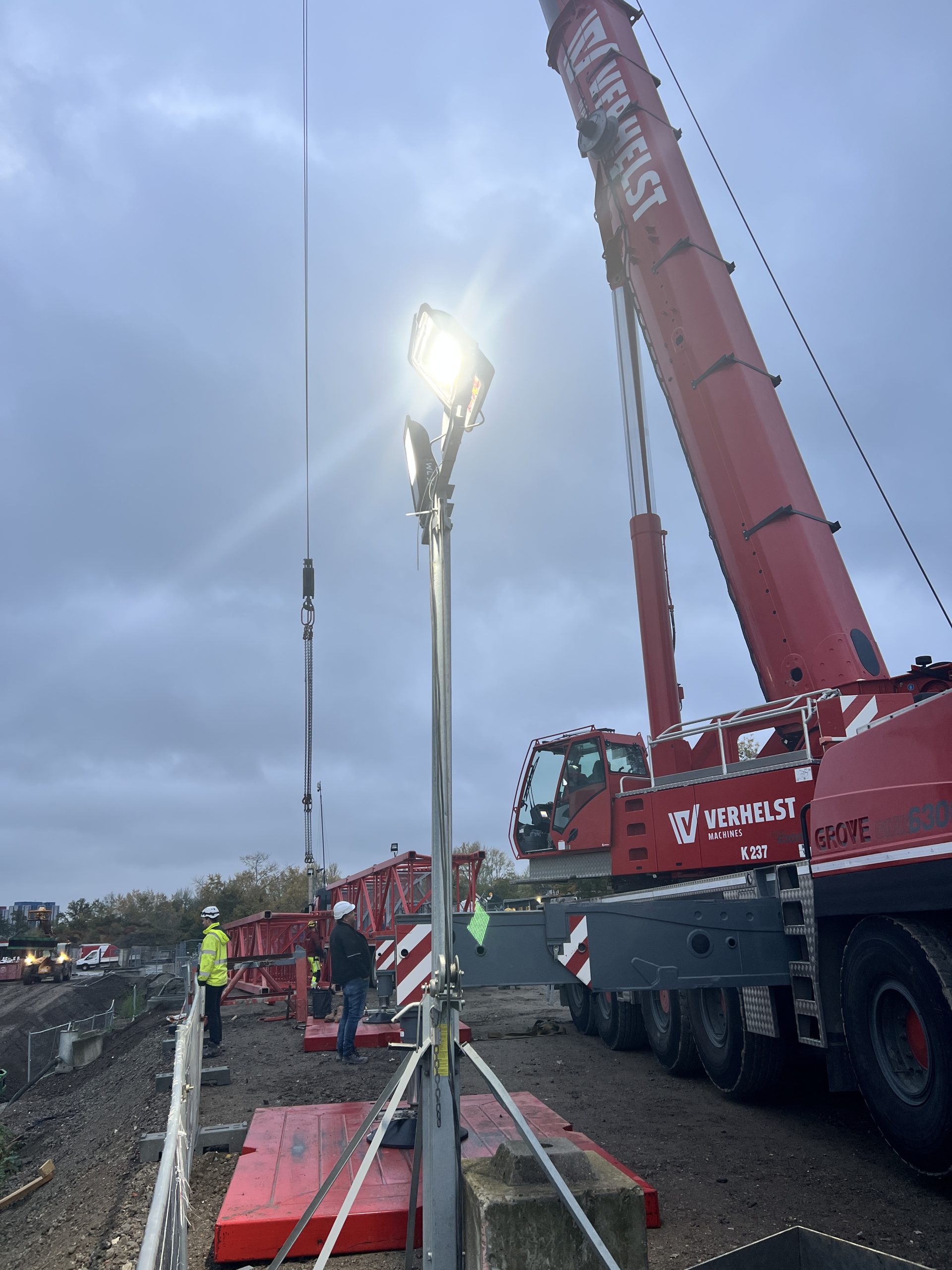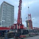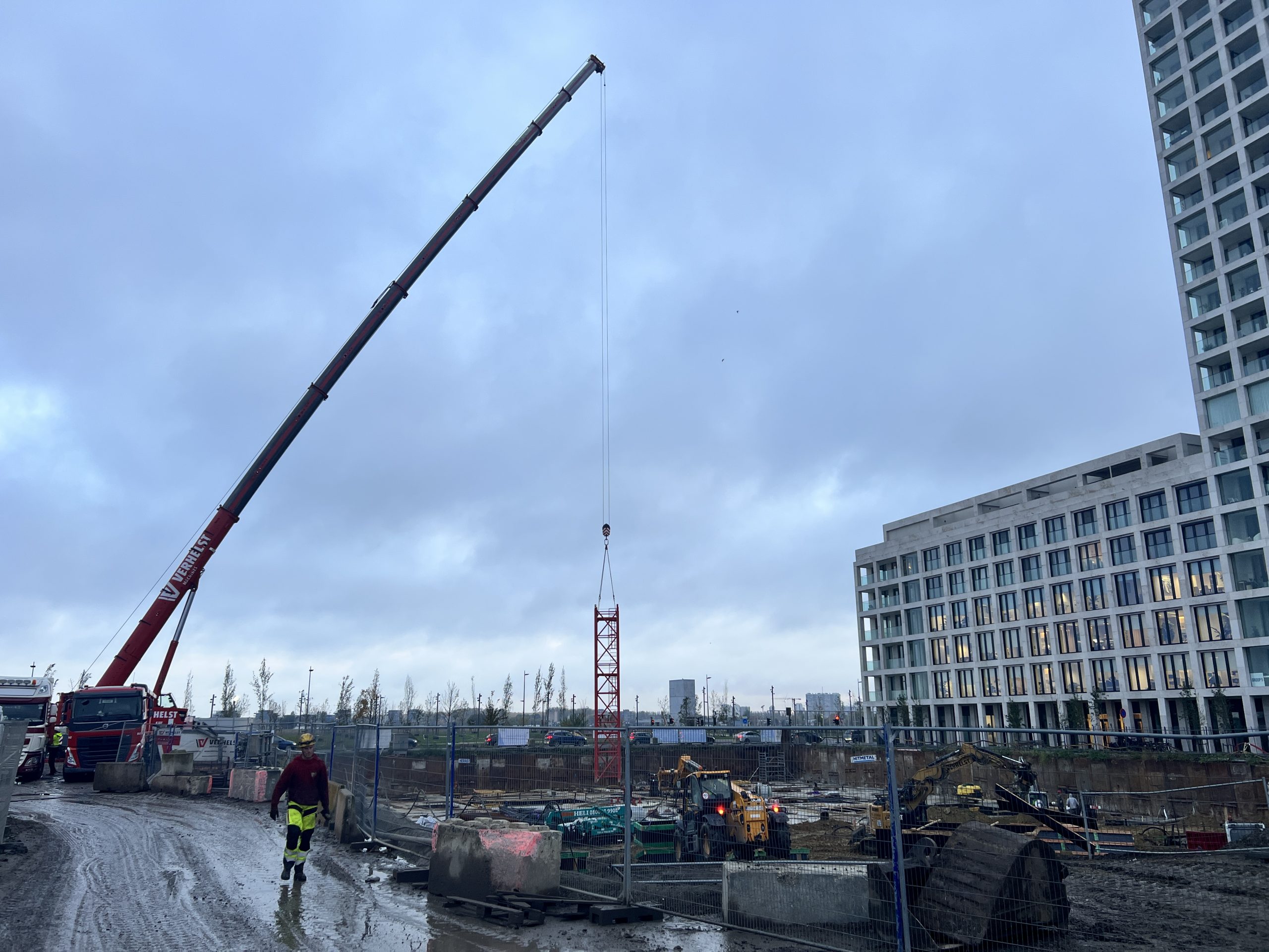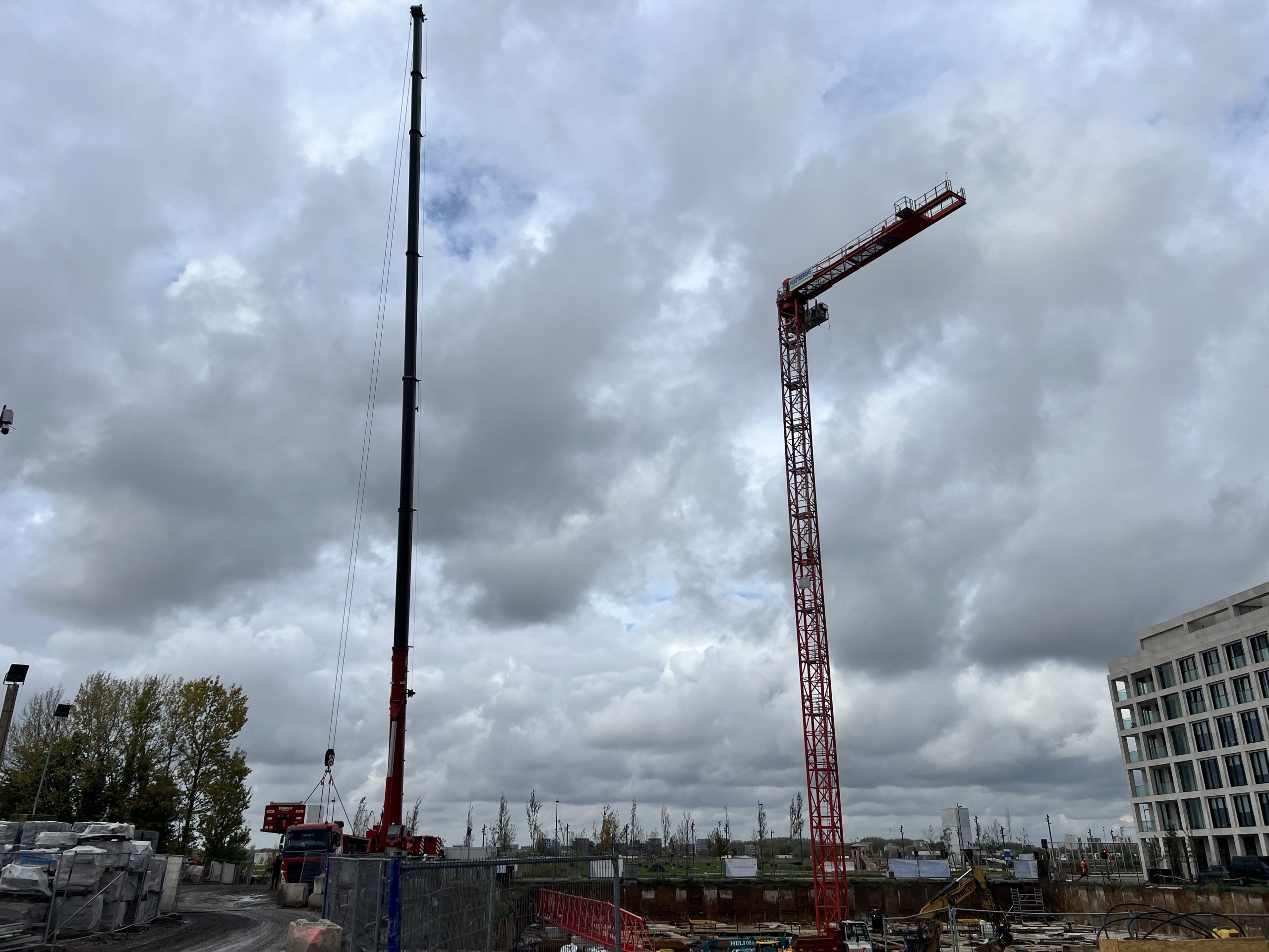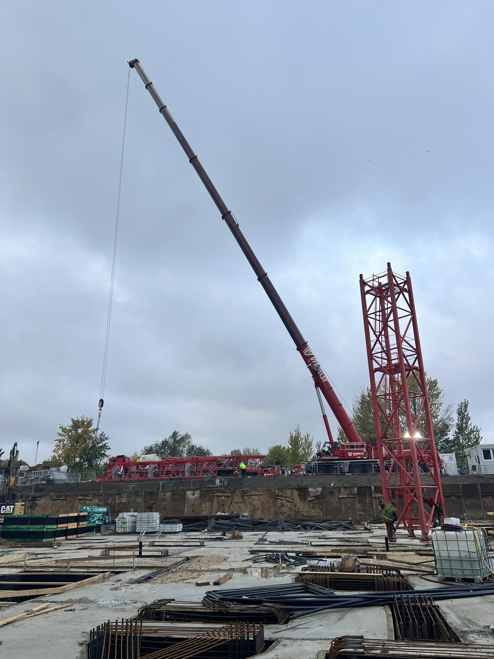 Vroeg in de ochtend hing er al een gespannen maar opgewonden sfeer op onze werf te Nieuw Zuid. De vrachtwagens met kraanonderdelen reden één voor één het terrein op, terwijl de ploeg zich klaarmaakte voor de montage. De zon brak net door de wolken toen de montagekraan, 300 T, zijn eerste beweging maakte – langzaam, precies en indrukwekkend.