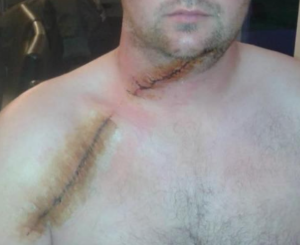 Diepe snijwonden aan hals en rechterschouder